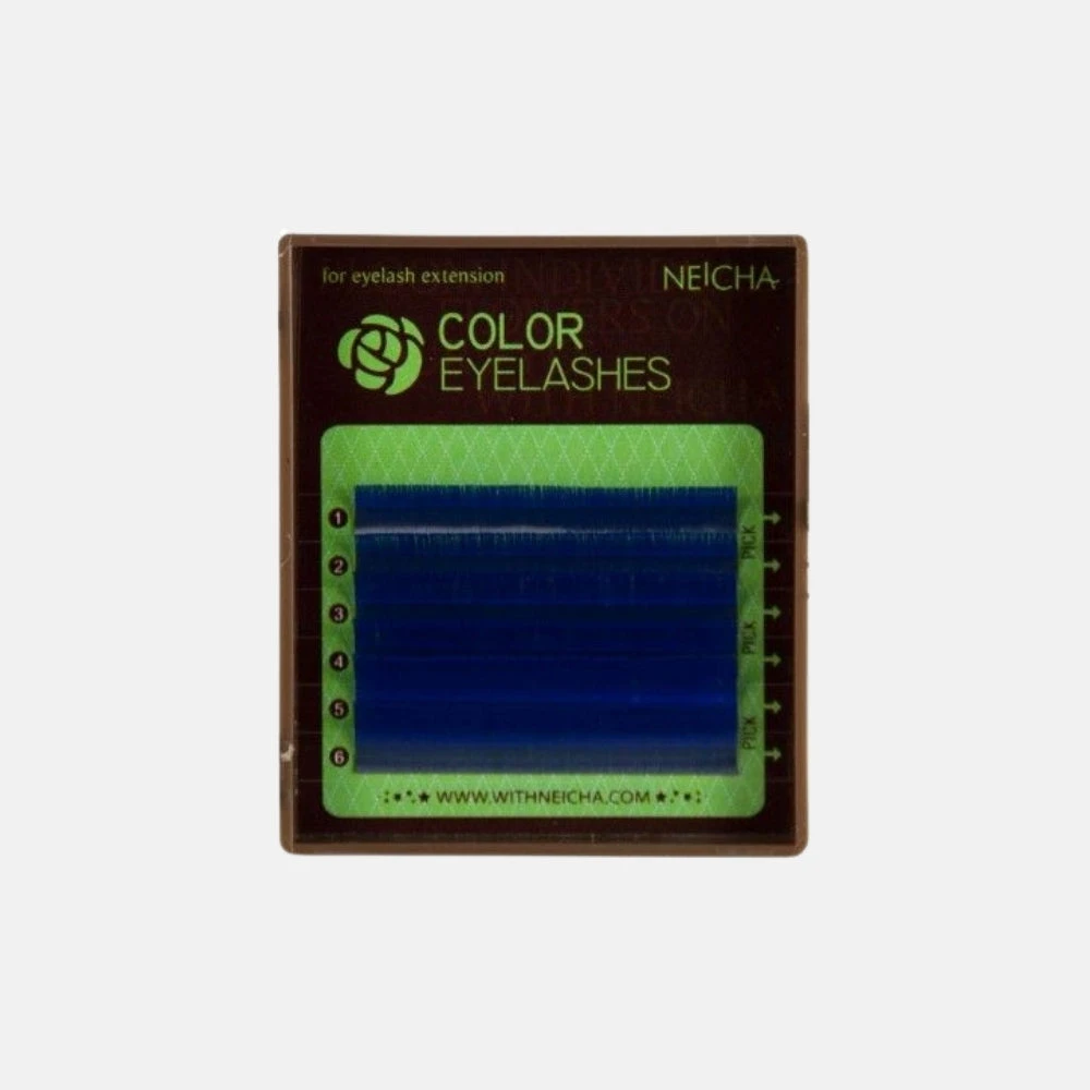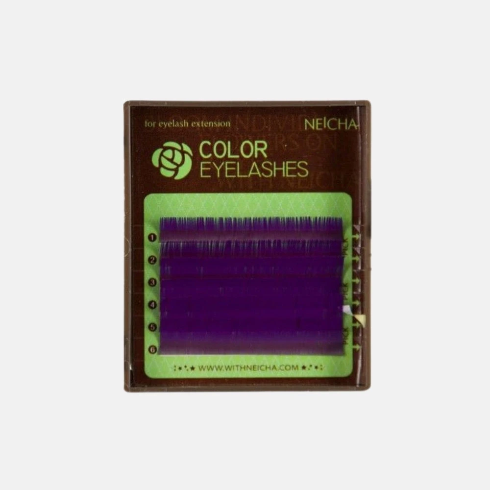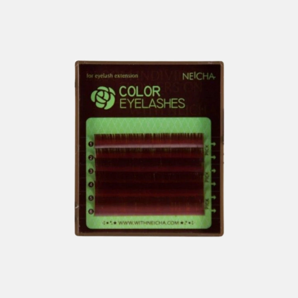 Extensiones de pestañas de color. En formato de 6 filas de largos variados (2 filas de 10 mm., 2 filas de 12 mm. y 2 filas de 14 mm.) Hechas a mano, de seda sintética.