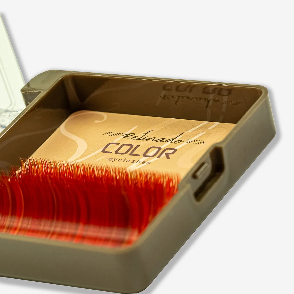 Extensiones de pestañas de tonos rojo, naranja y marrón entremezcladas. Vienen en formato de 6 tiras de largo variado.