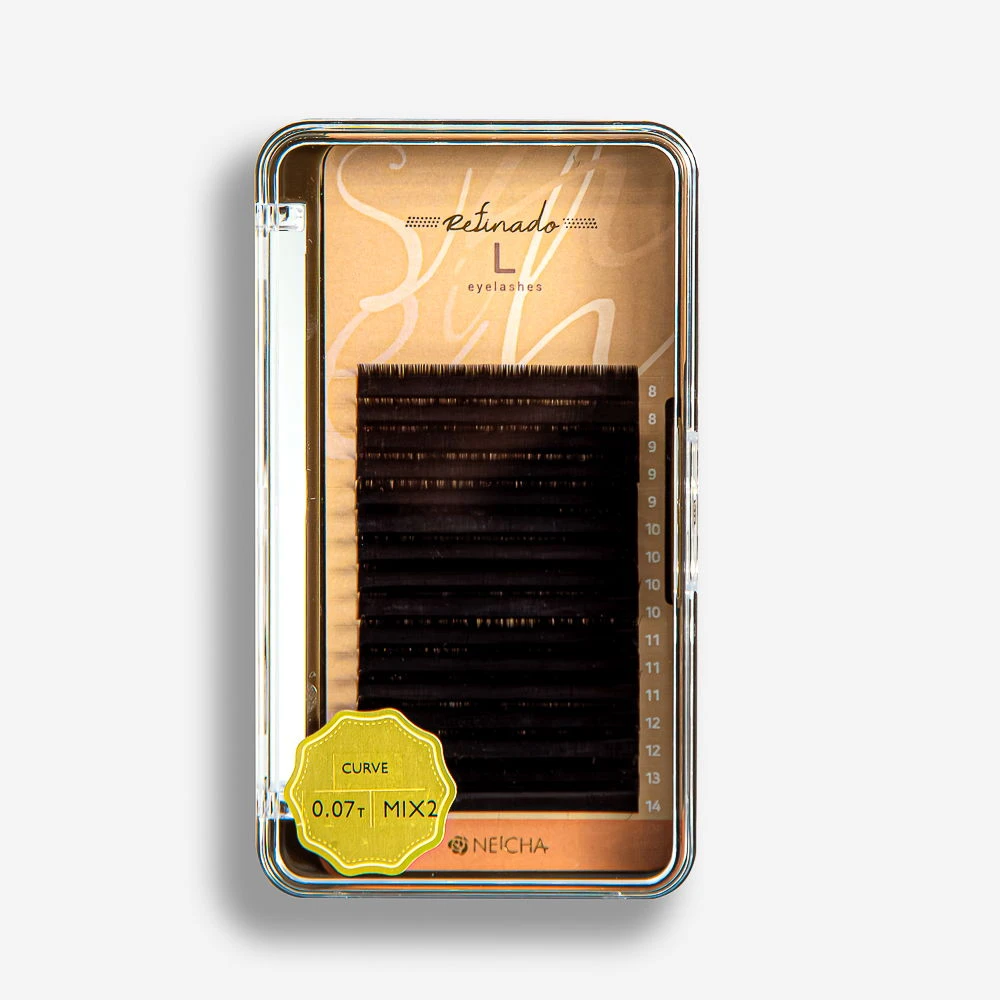 Extensiones de pestañas de seda sintética. Cada caja contiene de 16 tiras de extensiones, de largos variados de 8 a 14 mm.