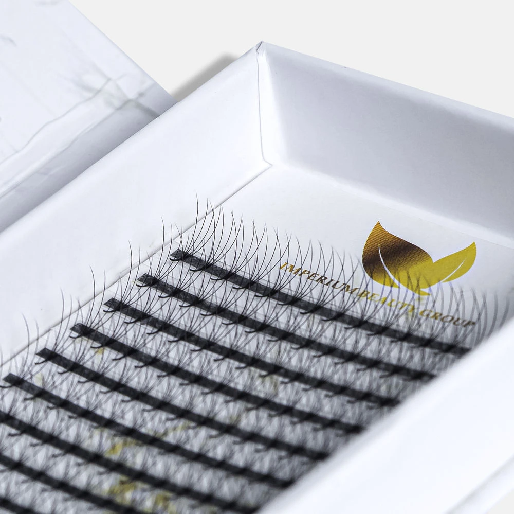 Extensiones de Pestañas Pre-hechas de 3D para la técnica de Volumen Ruso. Contiene 256 abanicos, cada uno formado por 3 extensiones. La caja contiene filas de largos variados de 9, 11, 13 y 15 mm.