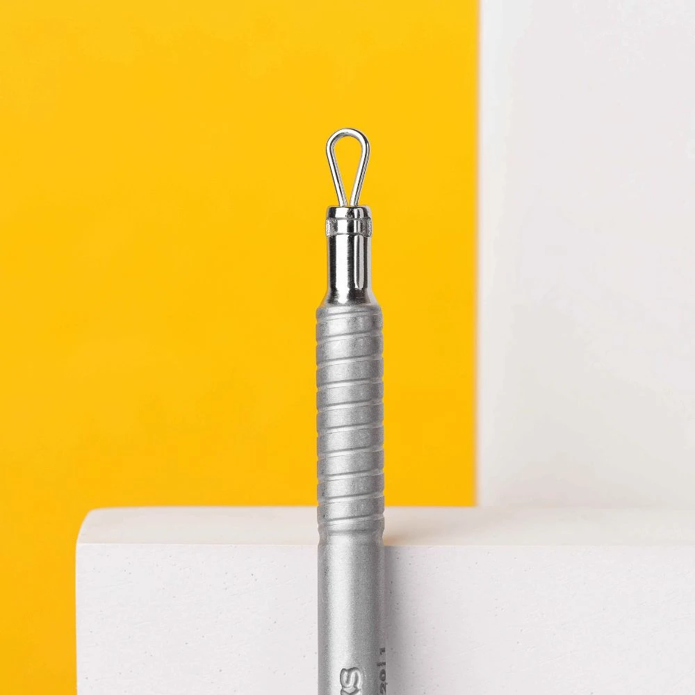Herramienta metálica con dos cucharas diseñada para ayudar a extraer puntos negros y granos sin dolor. Su mango es grande y antideslizante para trabajar cómodamente. Fabricado en acero inoxidable AISI 420.