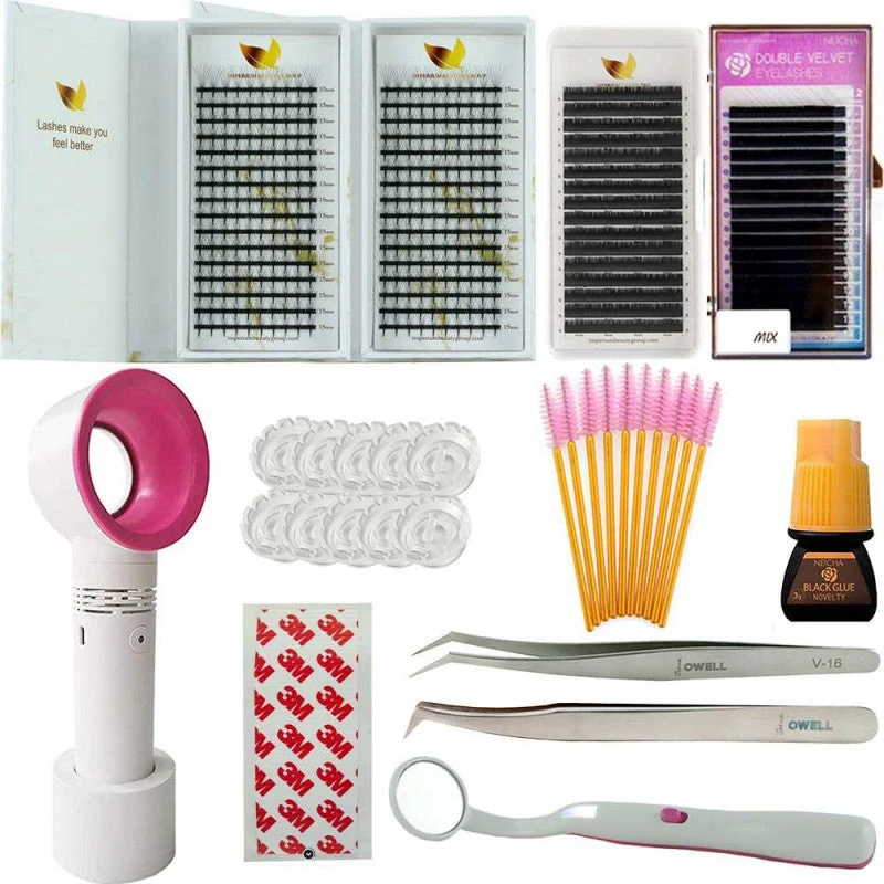 Este kit contiene los productos necesarios para realizar los servicios de extensiones de pestañas de volumen ruso.