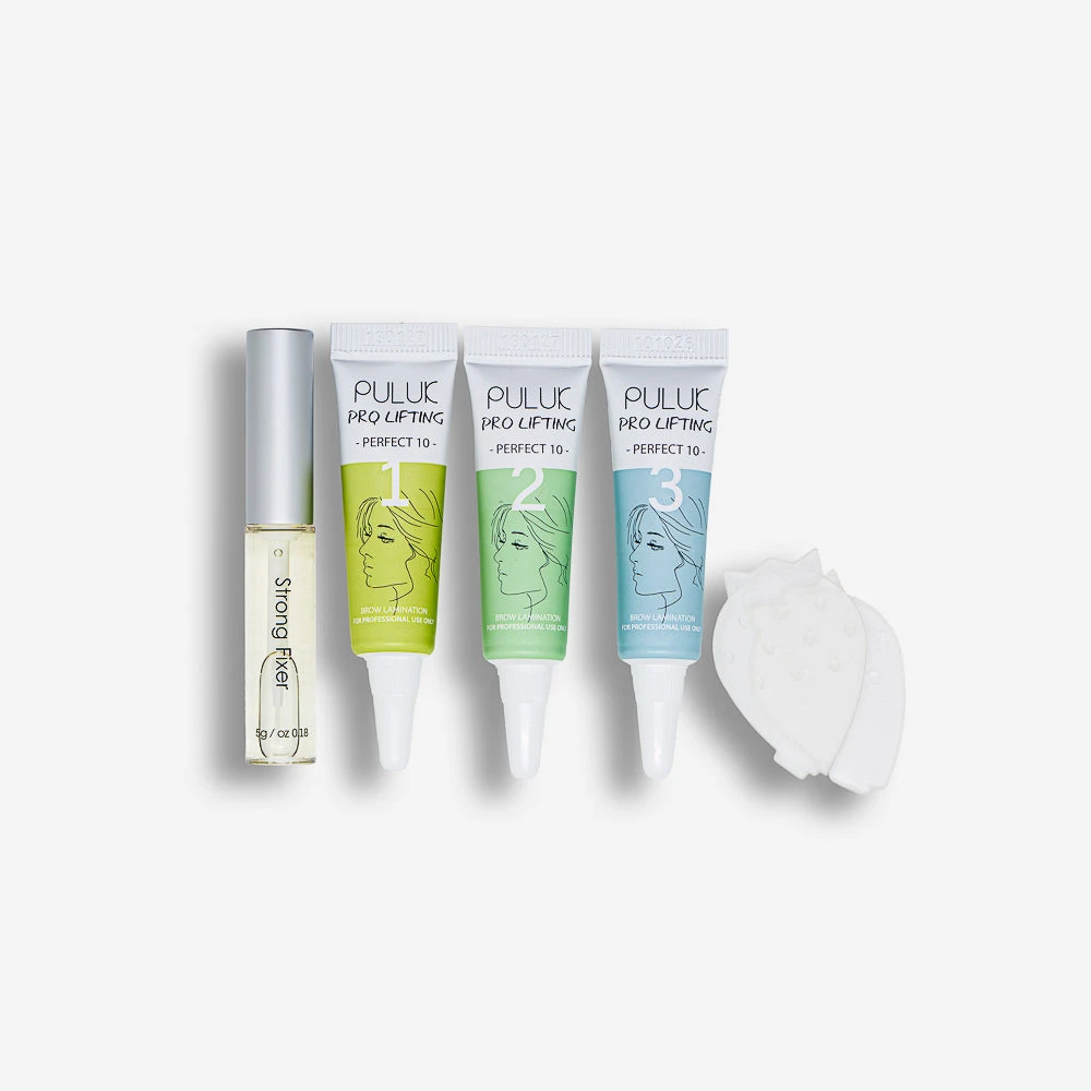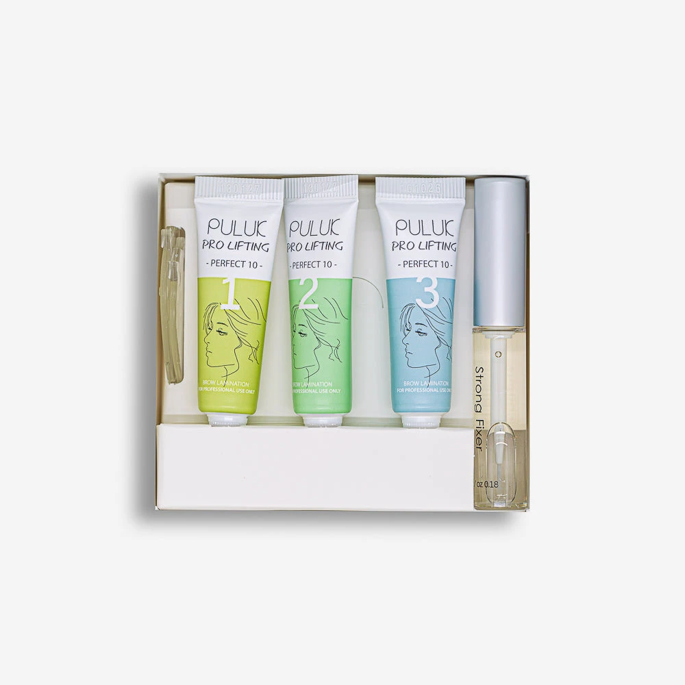 El kit Pro Lifting Brow Lamination de Puluk contiene los productos necesarios para realizar la laminación de cejas. Los productos contienen queratina y colágeno que promueven el crecimiento de las cejas naturales. El kit de elevación Pro se puede utilizar en combinación con el kit de laminación de pestañas Pro Wave. El kit está diseñado solo para uso profesional.