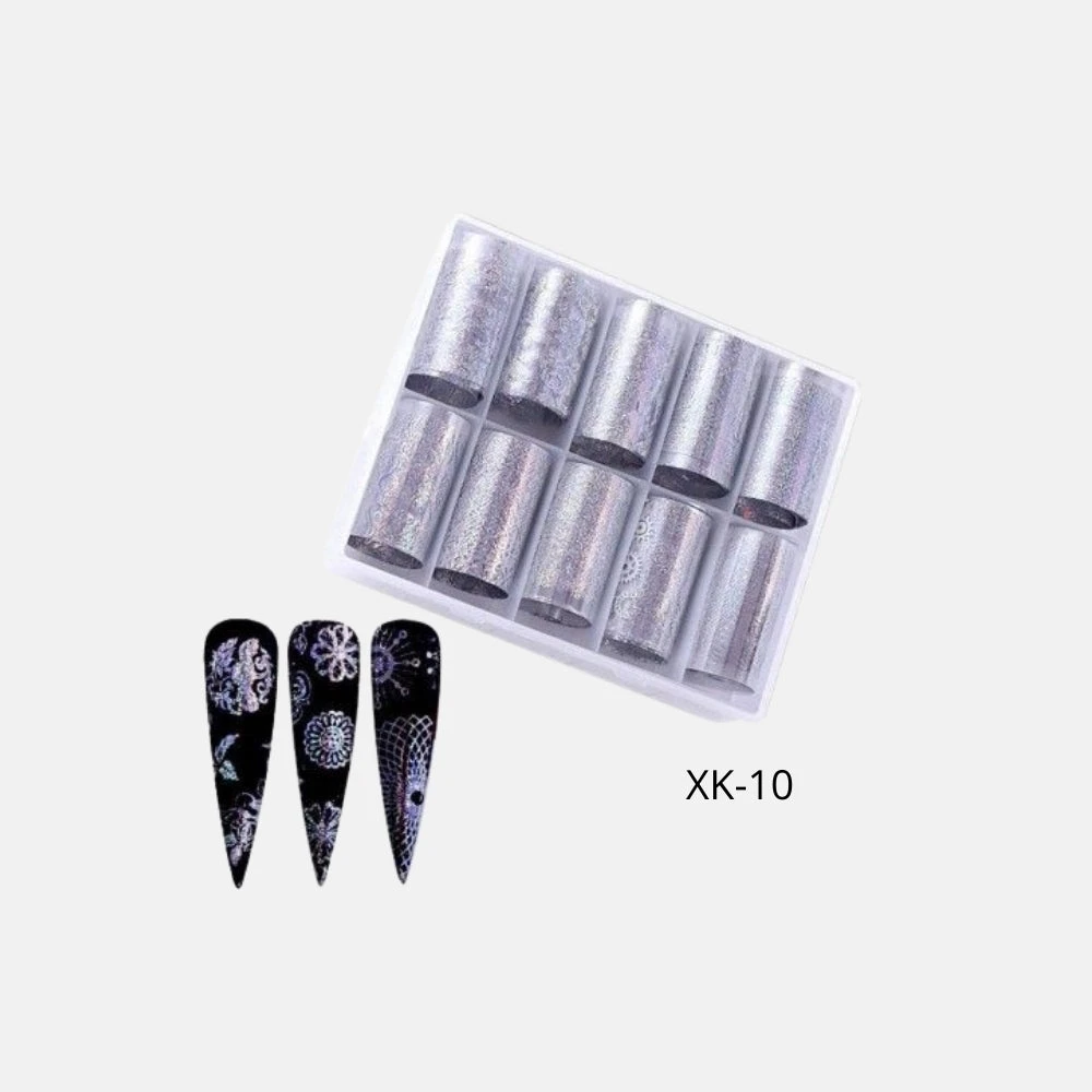 Pack de 10 rollos de Transfer Foil para decoración de uñas. Disponemos de 5 modelos diferentes de diseños. Es recomendable utilizar este producto con un Gel para Transfer Foil. Se puede utilizar tanto para esmalte tradicional como para esmalte permanente.