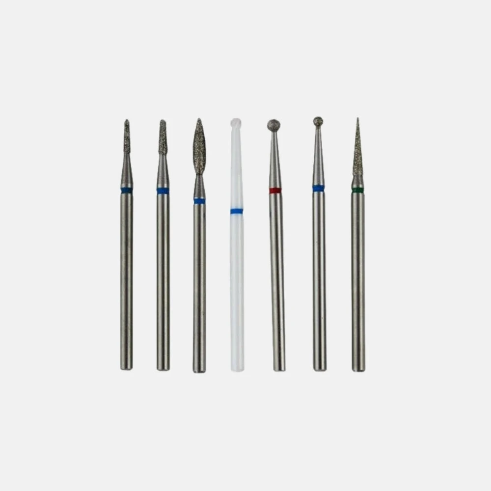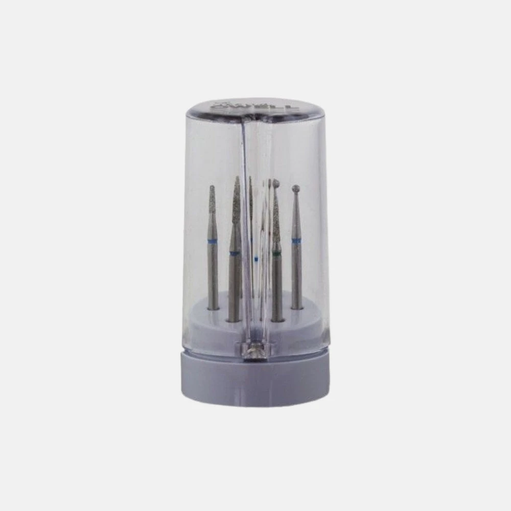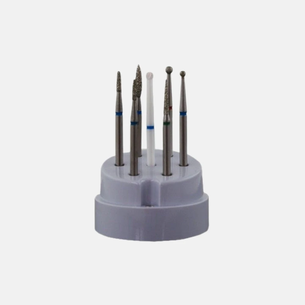 Compuesto por 7 fresas especiales de diamante y cerámica. Especiales para la eliminación de la cutícula y elaboración limpieza del cuerpo de la uña. Contiene 5 fresas de grano medio para preparar la cutícula, una fresa de grano fino para pulir las pieles más sensibles y una fresa de grano grueso para la eliminación de durezas.