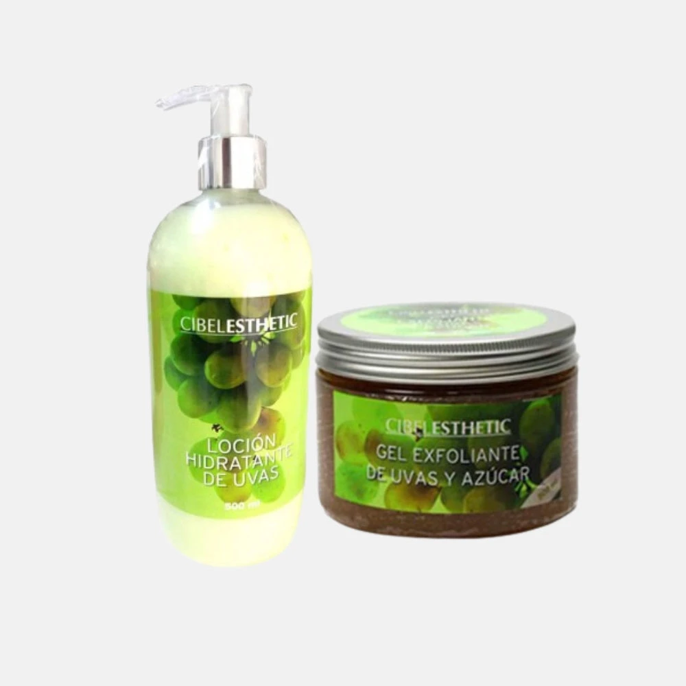 Pack con peeling y loción hidratante con textura suave y aroma a frutas, perfecto para los servicios corporales o de manicura y pedicura.
