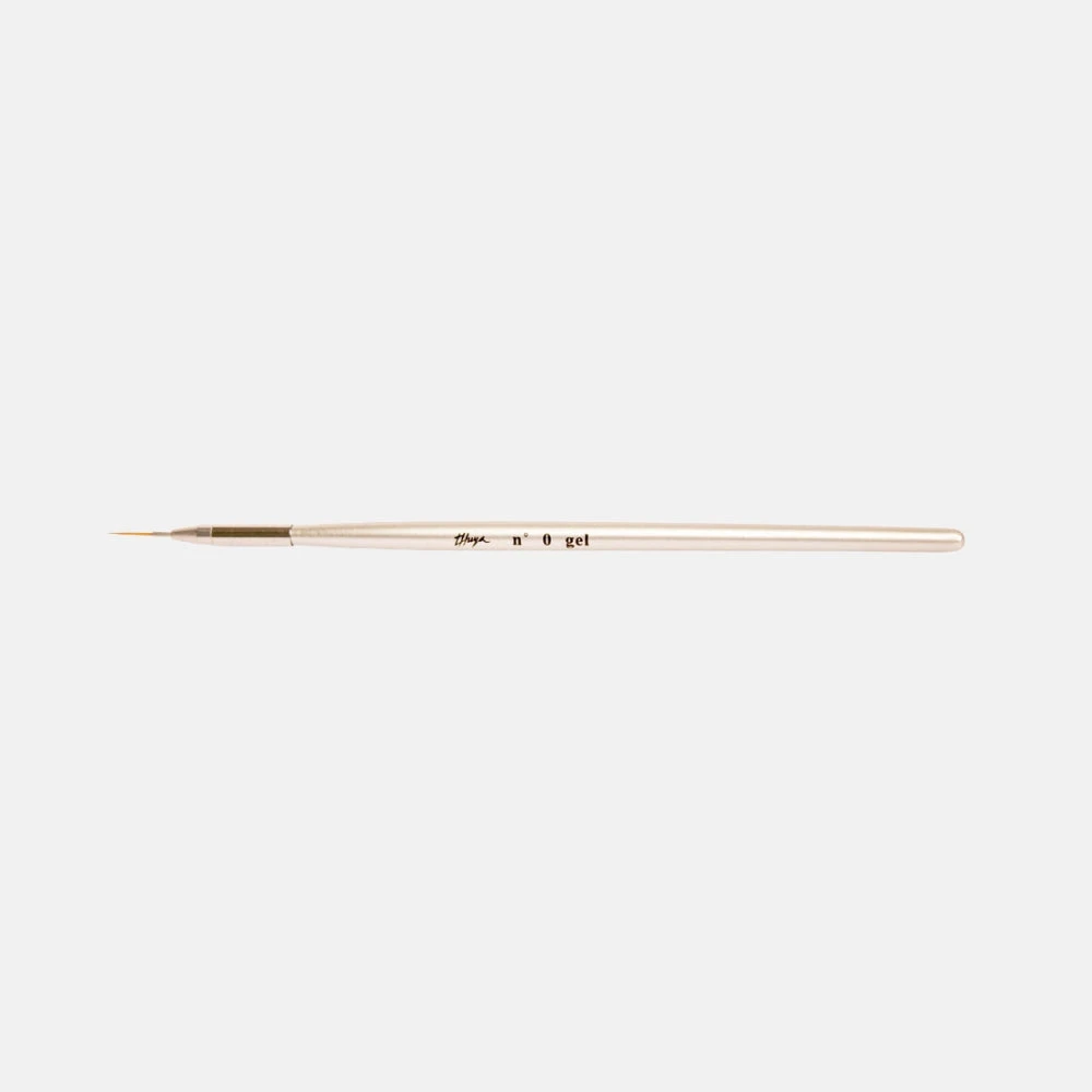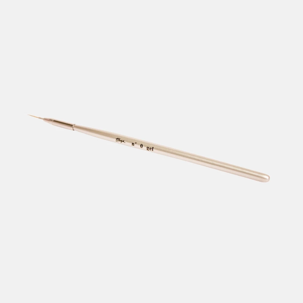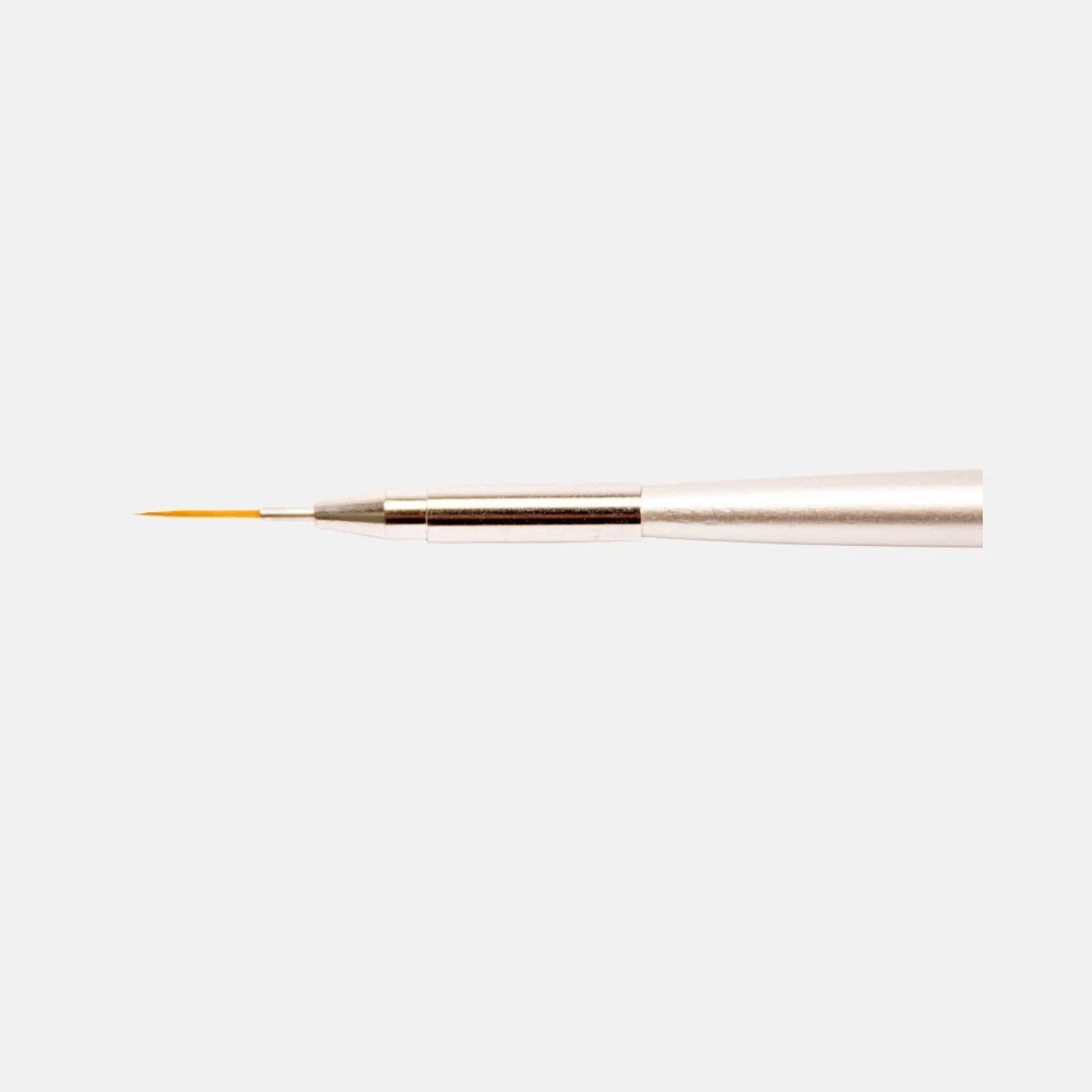 Pincel de pelo sintético para uñas. Su punta fina ayuda a mejorar la nivelación de gel en la zona de cutícula y lados de la uña. Con este pincel también puedes realizar diseños con gel paint.