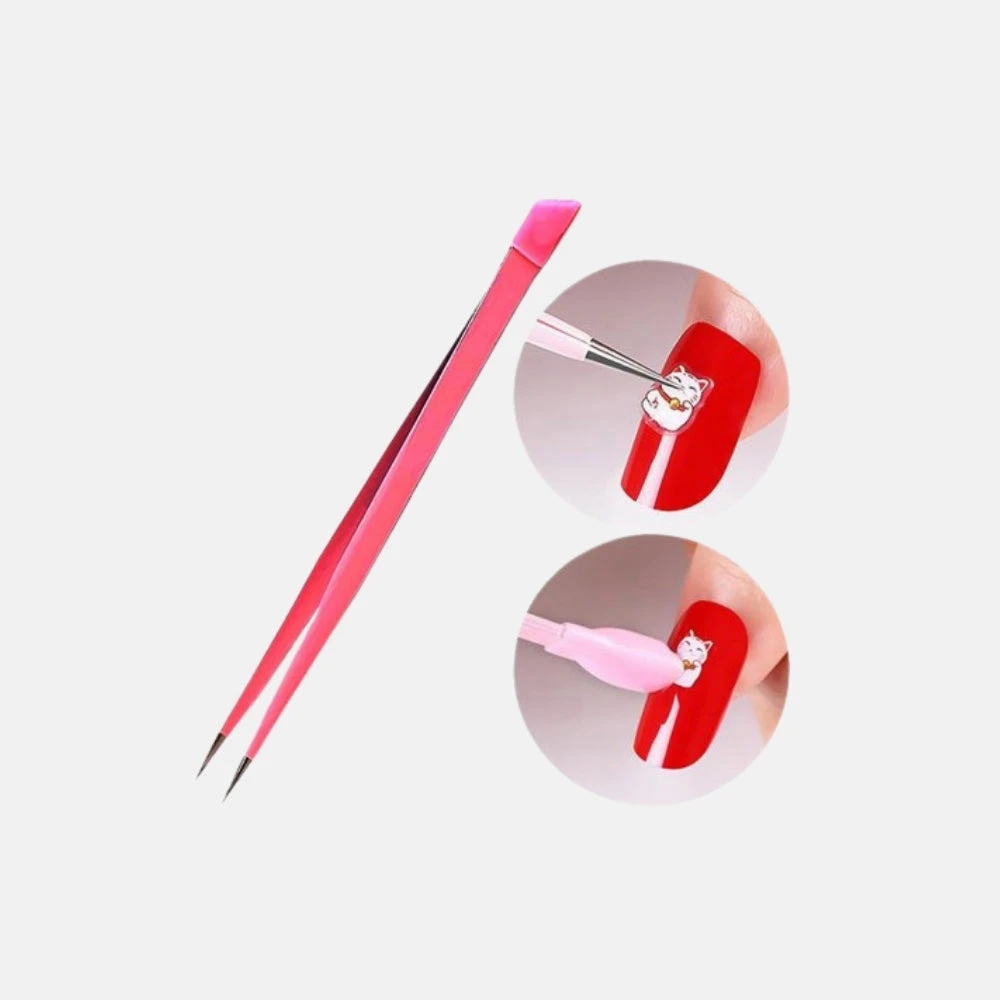 Pinza con punta extra fina que permite coger los stickers para uñas y con el otro extremo ayuda a que se adhieran sin burbujas a la superficie.