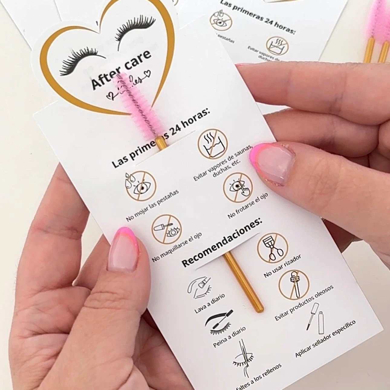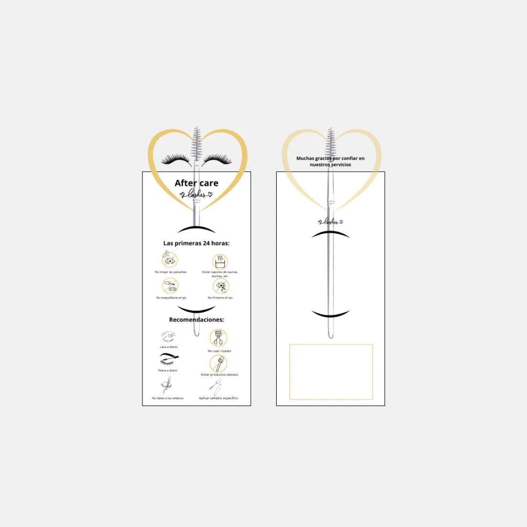 Tarjeta informativa de cuidados posteriores para extensiones de pestañas. Sorprende a tus clientas con este diseño exclusivo de una tarjeta de cuidados posteriores. Se puede vender por sí solo o incorporar un cepillo.